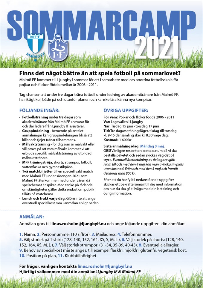 Vi påminner om MFF sommarcamp för dig som är född mellan 2006 - 2011 och att sista anmälningsdagen är måndag den 3 maj. Vi ser fram emot din anmälan! Ljungby IF 16 apr 2021