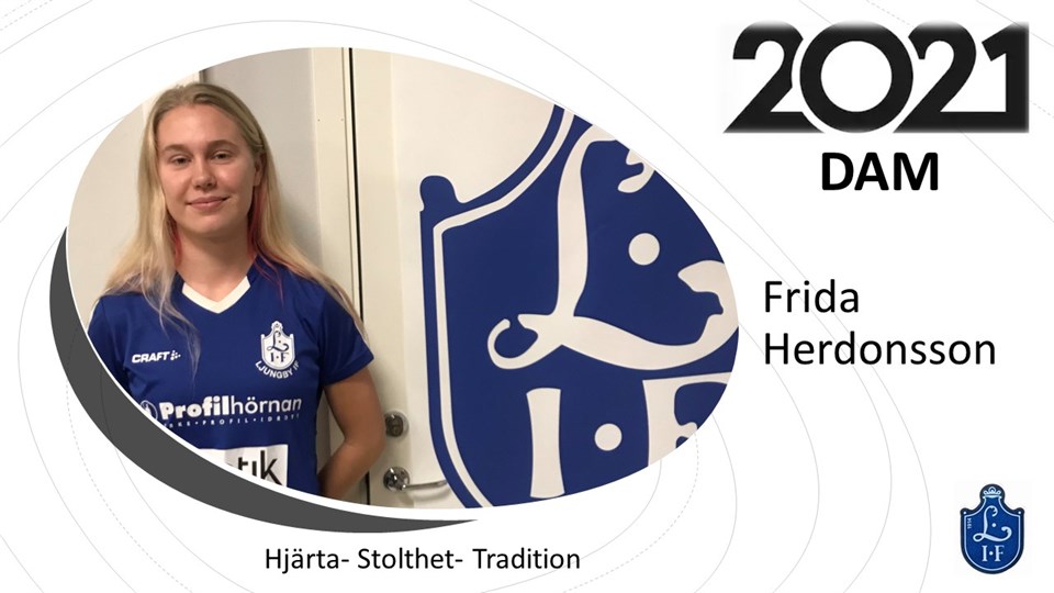 Frida Herdonsson född 02 har under flera år varit en viktig spelare i vårt unga damlag. Frida som är kapten agerar med pondus och auktoritet, och från sin plats som mittback styr hon laget. Snabb , stark och bra på huvudet. På och vid sidan om planen dessutom ett föredöme för andra spelare. Har haft erbjudande från andra klubbar men visar klubbkänsla och tillsammans med andra nyckelspelare en förutsättning inför 2021. Lycka till ! // Sportgruppen