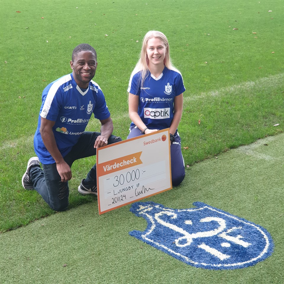 Vi är mycket glada över att från Sparbanksstiftelsen Kronan ha fått motta en summa på 30 000 kr. Pengarna är avsedda för att investera i en filmkamera som vi ska filma våra matcher med och där filmkameran sätts på ett stativ och följer spelet utan att man behöver ha någon som filmar matchen. Efter matchen kan tränarna ladda ner matchen från kameran till ett speciellt datasystem och sedan i lugn och ro gå igenom matchen samt tagga och namnge spelare i diverse situationer. På bilden ses Ivan N´diike från vårt herrlag och Frida Herdonsson från vårt damlag stoltsera med checken. STORT TACK till Sparbanksstiftelsen Kronan för detta fina pris.