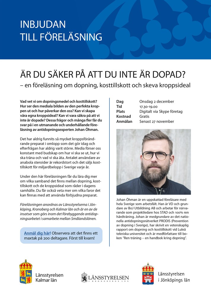 RF SISU erbjuder till den som vill en kostnadsfri digital föreläsning med Johan Öhman med temat "Dopning, kosttillskott och skeva kroppsideal". Föreläsningen äger rum onsdag den 2 december kl. 17.30 - 19.00 via Skype och all information gällande anmälning mm hittar du i det bifogade dokumentet. Välkommen med din anmälan!
