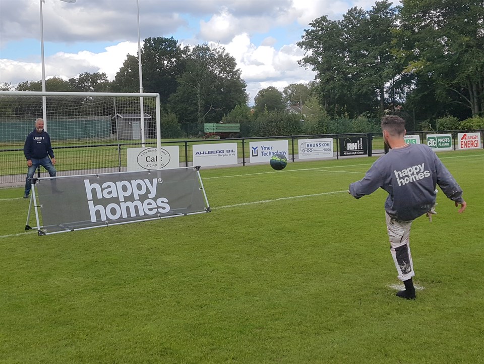 På fredag är det match på Lagavallen Ljungby, då Växjö Norra IF gästar oss. Under torsdagen levererade Happy Homes, som är huvudsponsor för matchen, sin reklamskylt. Vår spelare Evan Stronach och forne stormålvakten Johhny Wallin kunde inte låta bli att lattja lite med bollen över reklamskylten.