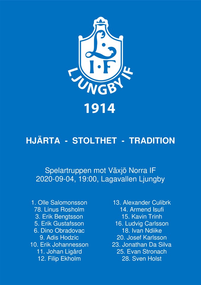 På fredag är det dags för nya äventyr för våra fotbollsherrar. De gästas då av Växjö Norra IF, ett lag som tippades som topplag inför seriepremiären. Men laget har på senare tid fått massor av grus i maskineriet och de huserar i nuläget precis ovanför det negativa kvalstrecket i den aktuella serietabellen. Faktum är att de kommer till Lagavallen Ljungby med tre raka förluster i bagaget och den föga imponerande målskillnaden 3-8 på dessa matcher. Laget har helt enkelt problem med målfabrikationen och har endast hittat rätt i motståndarnas målbur vid åtta tillfällen i seriespelet. Det är näst sämst i serien. Men samtidigt ska man ha i åtanke att laget är betydligt bättre än vad serietabellen utvisar. Förr eller senare hittar laget tillbaks till sitt forna jag, frågan är bara när. Kanske blir det redan på fredag och kanske blir det senare än så. Det gäller för vår del att inte underskatta fredagens motståndare, de är utan tvekan ett topplag om de bara hittar formen igen. Avspark sker klockan 19.00 på Lagavallen Ljungby. Ett stort tack riktar vi till Happy Homes som är huvudsponsor för derbymatchen. Vi tackar också våra sponsorer för matchbollarna som till denna match är skänkta av: DS Smith Packaging, Ljungby Rörmokeri, Mattias Gustafssons Måleri, Thages Livs, Tutaryds Mekaniska Verkstad, Älmby Entreprenad. Svenska Fotbollsförbundet har beslutat att man numera får ta emot maximalt 50 åskådare på matcherna. Ljungby IF har i sin tur beslutat att de personer som kommer att få närvara på våra A-lags hemmamatcher, fram tills det att något annat kommuniceras ut, är de som är medlemmar i vår medlemsklubb ”Club 1914” och där varje medlem har tillgång till en plats vardera och principen först till kvarn gäller. Vi ber er som tyvärr inte kommer att släppas in på arenan att respektera detta och rekommenderar er som vill se matchen att ladda ner appen ”Min Fotboll” där man kan köpa matchen för 29 kronor för att streama den. Vi hoppas dock att snart kunna välkomna alla som vill komma till Lagavallen för att se på fotboll, men fram till dess är det dessa regler som gäller.