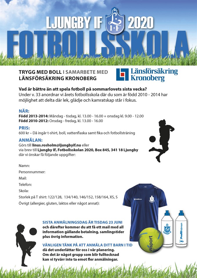Under v 33 kommer vi att anordna vår årliga fotbollsskola "Trygg med boll" i samarbete med Länsförsäkring Kronoberg för de barn som är födda 2010 - 2014. All information hittar du i den bifogade filen. Välkommen med din anmälan! Ljungby IF 29 maj 2020