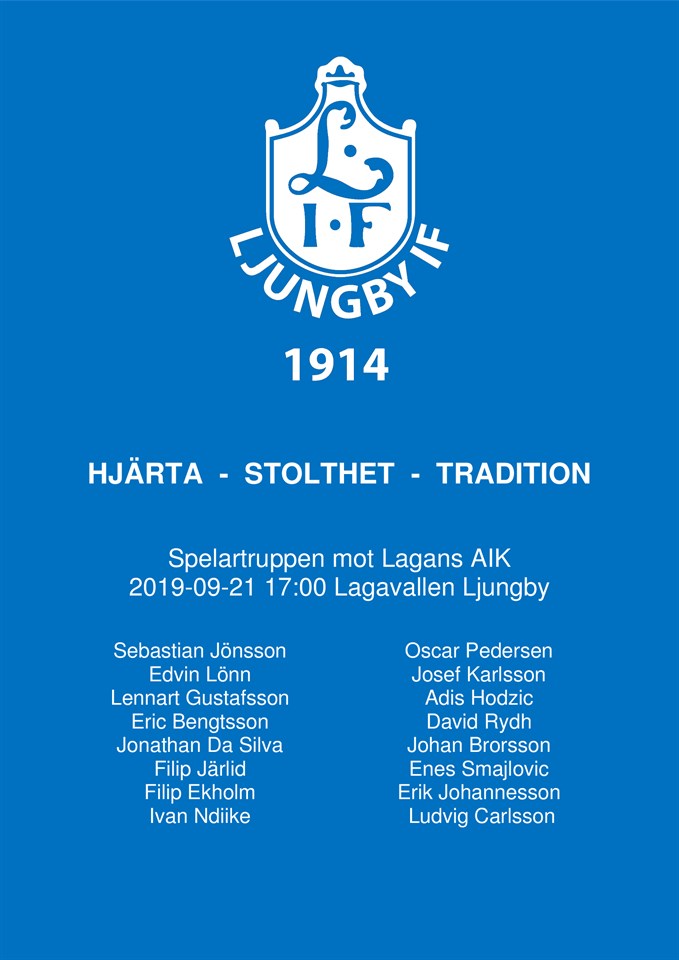 Klockan 17.00 i eftermiddag är det dags för lokalderby på Lagavallen Ljungby. Serietvåan Lagans AIK gästar våra seriesegrande herrar och det blir ett rafflande derby. Dessutom är det sista hemamatchen för säsongen, så missa inte chansen att ta en närmare titt på seriesegrarna. Tar du dessutom med en kompis så blir vi dubbelt så många. Avspark på Lagavallen Ljungby sker klockan 17.00. Hjärtligt välkomen. Matchvärdar: OnePartnerGroup och Ahlbergs Bil. Priset till Matchens Lirare är skänkt av Profilhörnan. Blommor till derbymatchen är skänkt av Janssons Blommor. Matchbollarna är skänkta av: Electrolux Professional, Enertech, Gibon Ljungby, Mark & Miljö, Mjäla Buss.