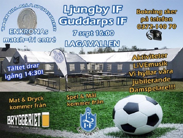 Skynda att boka plats i tältet inför derbydrabbningen på Lagavallen på lördag. Redan klockan 14.30 öppnar vårt Buffétält, där du är hjärtligt välkommen att boka plats på telefon 140 70, anknytning 3. Priset är 295 kronor per person och entrén är som sagt fri. Derbymatchen mot Guddarps IF blir ju som bekant en så kallad ”Enkronasmatch”, där våra sponsorer bjuder på inträdet. Vi tackar dem för stödet, samtidigt som vi hälsar dig hjärtligt välkommen till matcharrangemanget. Avspark sker klockan 16.00. Matchvärd: OnePartnerGroup. Blommor till matchen är skänkta av Janssons Blommor. Priset till matchens lirare är skänkt av Smålands Måleri. Matchbollar är skänkta av: Electrolux Professional, Ljungby Catering, Mark & Miljö, Mjäla Buss, Profilhörnan. Ett stort tack till vår sponsor Emballator Lagan Plast som sponsrar med 3-kronan och ELTT-ELON, Ljungby IF:s styrelse, Ohlssons Rör och Thomas Hellgren i Junsele som sponsrar med 1-kronan i denna match. Övriga sponsorer som sponsrar arrangemanget är: 1 000 kronor per LIF-mål: Swepart Transmission AB. 5-krona: Happy Homes, Ljungby kommun, Ljungby Schakt. 2-krona: Assemblin El, Claessons Transport, El-Center, Gibon Ljungby, Heimstaden, Handelsbanken, Kronobergs Bil, LJ Bygg, Ljungbybostäder, Ljungby Catering, Ljungby Glasmästeri, Ljungby Energi, Mobergs Tryckluft, Sultan Barbershop, Toyota Ljungby. 1-krona: Best Western Ljungby, Bjerstafs Begravningsbyrå, Bolmstads Pizzeria, Brunskogsgruppen, Bröderna Engvalls Bil, Bröderna Sandstedts Cykel & Motor, City Gross Ljungby, Empleo Bemanning och Rekrytering, Ica Maxi, Ilonas Gatukök, IMP, Gustav R Johansson, Lindvalls Chark, Ljungby Buss och Taxi, Ljungby Däck, Ljungby Golv, Ljungby Reklam, Mark och Miljö, Mjäla Buss, OnePartnerGroup, PacsOn, PS Olje AB, Profilhörnan, RH Dekor och Solfilm, Rör-Center i Ljungby, STC Ventilation, Swedbank, Thages Livs, Thörnqvists Måleri, Vittarydsverken.