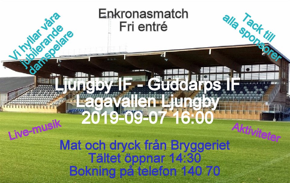 Derbymatchen mot Guddarps IF den 7 september på Lagavallen Ljungby blir en så kallad ”Enkronasmatch”, där våra sponsorer bjuder på inträdet. Vi tackar dem för stödet, samtidigt som vi hälsar dig hjärtligt välkommen till matcharrangemanget. Avspark sker klockan 16.00, men redan klockan 14.30 öppnar vårt Buffétält, där du är hjärtligt välkommen att boka plats på telefon 140 70, anknytning 3. Priset är 295 kronor per person och entrén är som sagt fri. Ett stort tack till våra sponsorer som sponsrar med 1-kronan i denna match: Happy Homes, Ilonas Gatukök, Ljungby Buss och Taxi, Ljungby Reklam, PacsOn, STC Ventilation, Thages Livs, Thörnqvists Måleri.