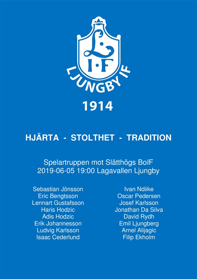Du missar väl inte fotbollsmatchen på Lagavallen Ljungby ikväll klockan 19.00. Slätthögs BoIF kommer på besök och vi spelar om nya, friska seriepoäng. En uppgörelse som är väl värd att beskåda. Hjärtligt välkommen till Lagavalen Ljungby du också. Blommorna till matchen är skänkta av Janssons Blommor. Priset till matchens lirare är skänkt av Lindvalls Chark och pengarna går till Barndiabetesfonden. Onsdagens matchbollar är skänkta av: Bardarnas Zoo JBM Skrot & Metall Ljungby Maskin Ohlssons Rör Sysmec Herr 5 jun 2019 0kommentarer