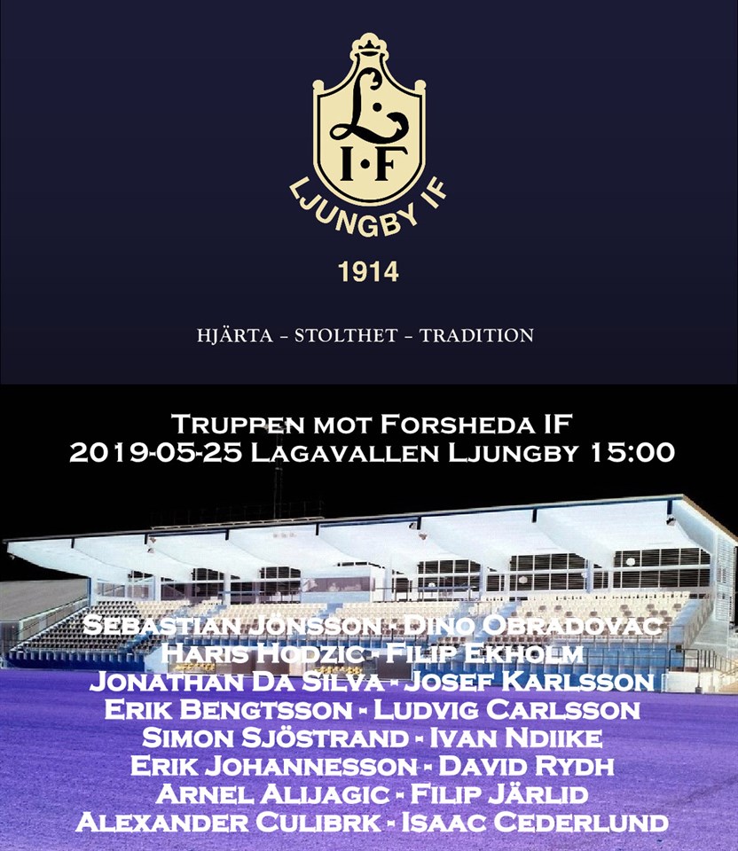 Du missar väl inte dagens match på Lagavallen Ljungby, när Forsheda IF gästar oss. Avspark sker klockan 15.00. Hjärtligt välkommen du också. Priset till Matchens Lirare är skänkt av Ljungby Reklam Blommorna till derbymatchen är skänkta av Janssons Blommor Dagens matchbollar är skänkta av: Fastighetsbolaget Garvaren, Konceptor, Ottosson Tung- & Specialtransporter, PMU Rep & Smide, Rörcenter i Ljungby.