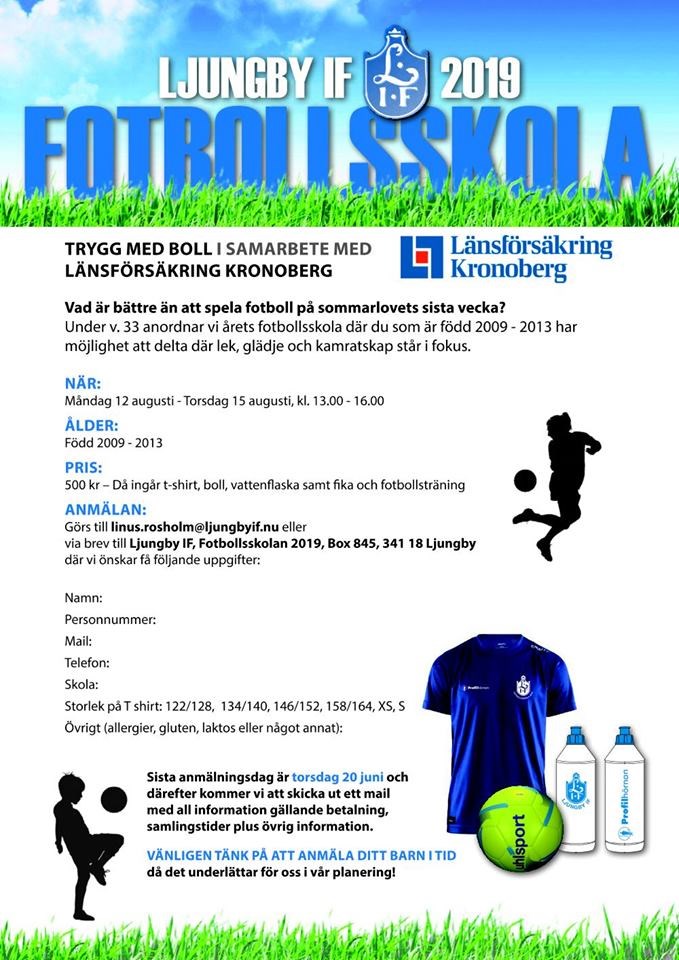 I samarbete med Länsförsäkring Kronoberg anordnar vi under v 33(mån-tors) fotbollsskola för dig som är född 2009-2013. Välkommen med din anmälan enligt bilden ovan (klicka på pilarna nere till höger på bilden för att förstora densamma).