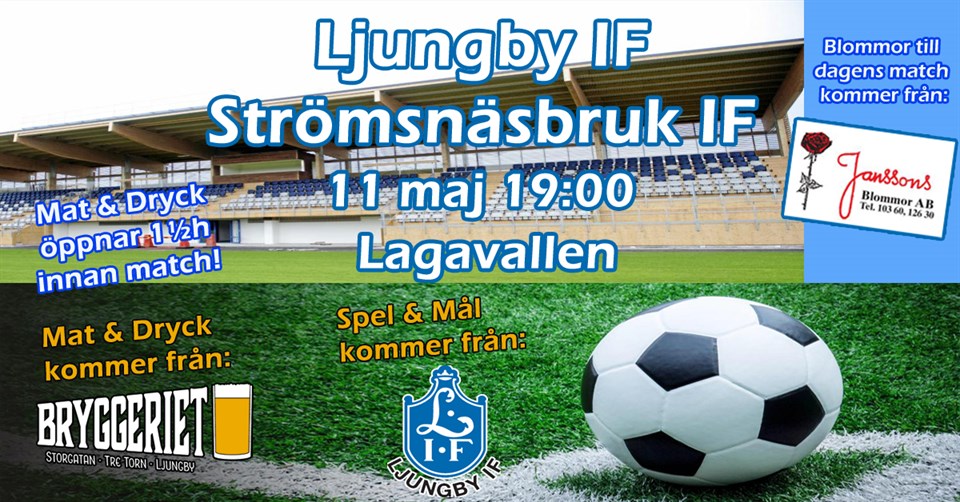 På lördag är det dags för säsongens första derbydrabbning på Lagavallen Ljungby klockan 19.00. Ja, du läste rätt med tiden. Strömsnäsbruks IF gästar oss då, liksom Toyota Ljungby som ställer ut bilar och utser Matchens Lirare. Melvin Andersson sjunger nationalsången, det blir Sportquiz och Livemusik med trubadur och det blir prisutdelning till Dans Minnesstipendiater. Mat- och öltält finns givetvis också och glöm därför inte att omgående boka din plats via kansliet på telefon 140 70. En helfestlig fotbollskväll med andra ord. Hjärtligt välkommen du också och ta gärna med en kompis så blir vi dubbelt så många. Lördagens matchbollar är skänkta av: Enertech Gibon Lars Roubert LJ Bygg Profilhörnan