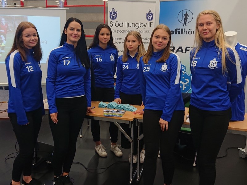 Våra seniorlag hjälpte till på föreningsmässan I ljungby Arena, såväl inne på själva utställningen som ute på parkeringsplatsen. Och de gjorde det med den äran. På bilden syns, från vänster; Tilda Eriksson, Josefine da Silva, Emmelie Önnestam, Meja Holgersson, Hanna Otterholm och Frida Herdonsson