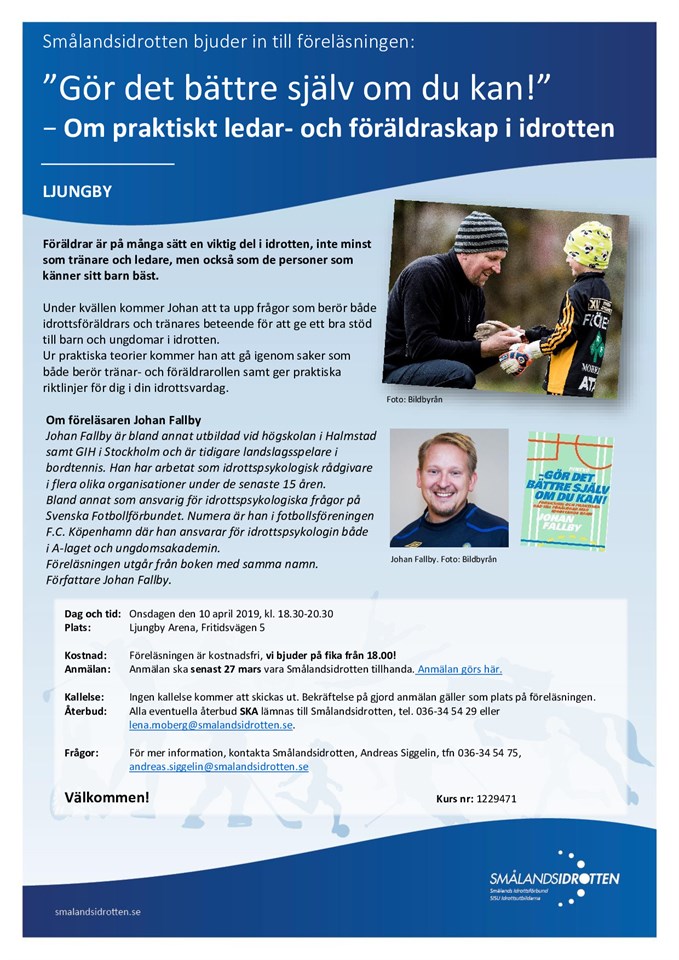 …en fantastisk föreläsning i Ljungby Arena med Johan Fallby, onsdagen den 10 april 2019, kl. 18.30-20.30. Temat är ”Gör det bättre själv om du kan” och handlar om praktiskt ledar- och föräldraskap i idrotten. Det här är en av vårens viktigaste föreläsningar i Ljungby. Klicka på bilden för mer info och anmälan.