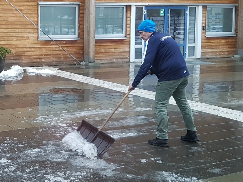 Det skiftande vädret för någon vecka sedan skapade arbetstillfällen på Lagavallen Ljungby. Det gällde då att få bort slasket innan det frös till is igen, något som höll fler än vaktmästarna sysselsattat. Men nu verkar ändå våren vara lite på gång, kan det vara som så att denne man har något med det också att göra?