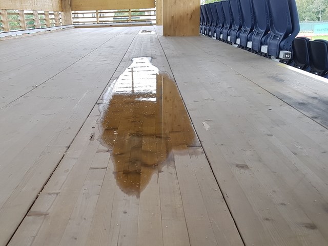 Hösten speglar sig i golvet på vår läktare på Lagavallen Ljungby. En av orsakerna till detta är den glasvägg som tillfälligt är nedmonterad och som ger naturen och vinden fritt spelrum till läktarens övre del.