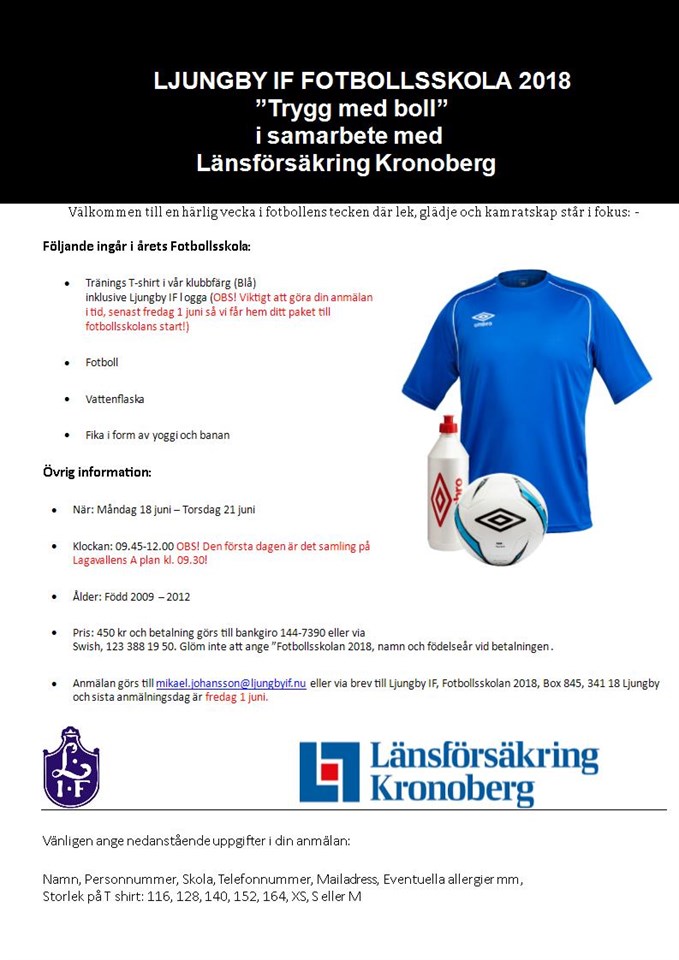 I samarbete med Länsförsäkring Kronoberg arrangerar Ljungby IF fotbollsskola för killar och tjejer födda 2009-2012. Fotbollsskolan "Trygg med boll" går av stapeln under vecka 25 och vi hälsar alla deltagare hjärtligt välkomna. Mer info om Trygg med boll hittar du här. Ljungby IF 29 maj 2018 0kommentarer