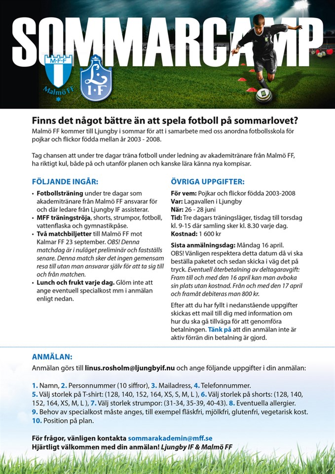 Finns det något bättre än att spela fotboll på sommarlovet? Malmö FF kommer till Ljungby i sommar för att i samarbete med oss anordna fotbollsskola för pojkar och flickor födda mellan år 2003 - 2008. Ta chansen att under tre dagar träna fotboll under ledning av akademitränare från Malmö FF, ha riktigt kul, både på och utanför planen, och kanske lära känna nya kompisar. Spara ned bilden ovan, eller gå till vår Campsida för mer info.