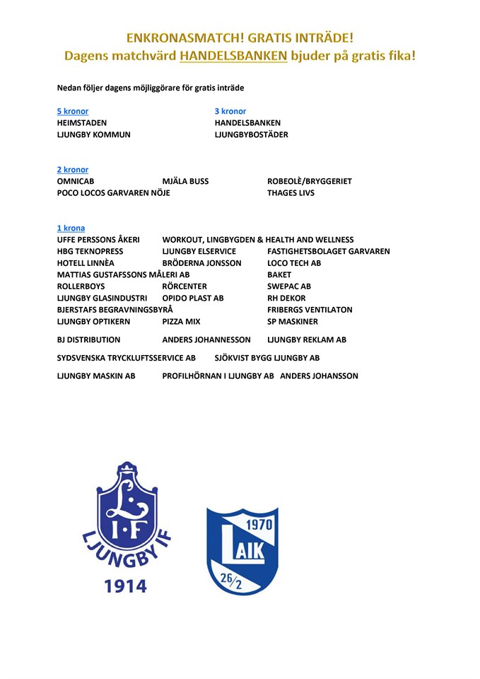 Nästa lördag, 14 september möter våra herrar Lagans AIK i ett hett derby på Lagavallen med matchstart kl. 15.00. Denna match kommer vara en så kallad enkronas match där våra fantastiska sponsorer bjuder vår publik på fri entré samt att vår matchvärd, Handelsbanken bjuder alla åskådare på fika. På bifogad bild ser du vilka som i nuläget är med och möjliggör detta evenemang och vill du också göra det antingen med ditt företag eller som privatperson är du välkommen att kontakta Linus Rosholm på 0372-140 70 eller via mail, linus.rosholm@ljungbyif.nu så berättar han mer om upplägget. Dela och sprid gärna denna information så hjälps vi åt att skapa en härlig inramning till denna spännande match. Varmt välkommen till Lagavallen!