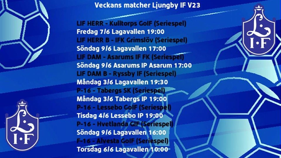 VECKOSCHEMA FÖR VÅRA REPRESENTATIONS- OCH JUNIORLAG Vecka 24 10/6-16/6 Herrar Måndag: Cupmatch mot Urshults IF borta, Urdavallen Urshult 19:00 Tisdag: Träning 17:30-19:00 Torsdag: Träning 19:00-20:30 Lördag: Seriematch mot Bankeryds SK borta, Furuvik 1 Bankeryd 13:00 Söndag: Seriematch B-laget mot Bredaryd Lanna IK Lagavallen 14:00 Damer Måndag: Träning 17:30-19:00 Tisdag: Träning 19:00-20:30 Torsdag: Träning 17:30-19:00 Söndag: Seriematch mot Räppe GoIF Lagavallen 17:00 Juniorlag Måndag: Träning 17:00-18:30 Tisdag: Seriematch mot Gislaveds IS Lagavallen 19:00 Fredag: Träning 17:00-18:30 P15/16 Måndag: Träning 18:30-20:00 Tisdag: Seriematch mot Tingsryd United FC Lagavallen 19:15 Torsdag: Träning 19:00-20:30 Söndag: Seriematch mot Åseda IF borta, Stena Parken 1 Åseda 11:00 Söndag: Seriematch mot Gislaved IS borta, Ryttarvallen 1 Gislaved 18:00 F15 Måndag: Träning 17:15-18:45 Onsdag: Träning 18:45-20:15 Torsdag: Träning 18:45-20:15 Söndag: Seriematch mot Växjö DFF borta, Östra IP Växjö 12:00 Ljungby IF 10 jun 2024 0kommentarer