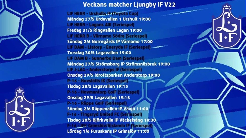 VECKOSCHEMA FÖR VÅRA REPRESENTATIONS- OCH JUNIORLAG Vecka 22 27/5 – 2/6 Herrar Måndag: Cupmatch mot Urshults IF, Urdavallen 1 Urshult 19:00 Tisdag: Träning 17:30-19:00 Onsdag: Träning 18:00-19:30 Fredag: Seriematch mot Lagans AIK, Ringvallen Lagan 19:00 Damer Måndag: Träning 17:30-19:00 Måndag: Seriematch Dam B Sunnerbo Dam Strömsborg IP Strömsnäsbruk 19:00 Tisdag: Träning 19:00-20:30 Torsdag: Seriematch mot Liatorp-Eneryda IF, Lagavallen 19:00 Juniorlag/B-lag Måndag: Träning 17:00-18:30 Tisdag: Träning 18:45-20:15 Onsdag: Match mot Anderstorps IF, Idrottsparken Anderstorp 19:00 Fredag: Träning 17:00-18:30 P15/16 Måndag: Träning 18:30-20:00 Tisdag: Seriematch mot Hovslätts IK, Lagavallen 19:15 Onsdag: Seriematch mot Hovmantorp GoIF, Lagavallen 19:15 Torsdag: Träning 19:00-20:30 Söndag: Seriematch mot Räppe GoIF borta, Räppevallen Växjö 11:00 F15 Måndag: Träning 17:15-18:45 Tisdag: Seriematch mot Tingsryd United FC borta, Björkvalla IP Väckelsång 18:30 Torsdag: Träning 18:45-20:15 Lördag: Seriematch mot IFK Grimslöv/Vislanda IF borta, Furuskans IP Grimslöv 11:00
