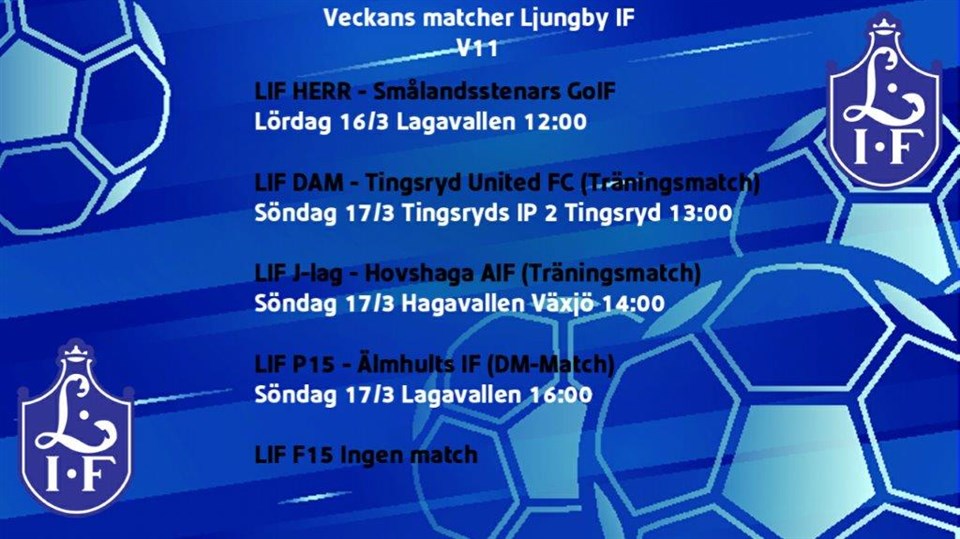 Här kommer schemat över matcherna till helgen. En ny match som tillkommit är på söndag, 17 mars kl. 14.00 då vårt Herr B lag möter Agunnaryds IF på Lagavallens konstgräs. Välkomna till Lagavallen! Ljungby IF 14 mar 2024