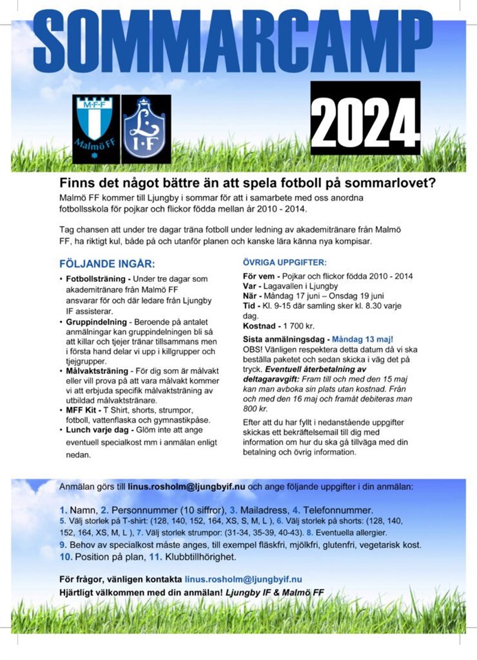 Mellan den 17- 19 juni är det återigen dags för vår sommarcamp i samarbete med Malmö FF för de som är födda 2010- 2014. Klicka på bilden för att ta del av all information och välkommen med din anmälan. Ljungby IF 7 mar 2024