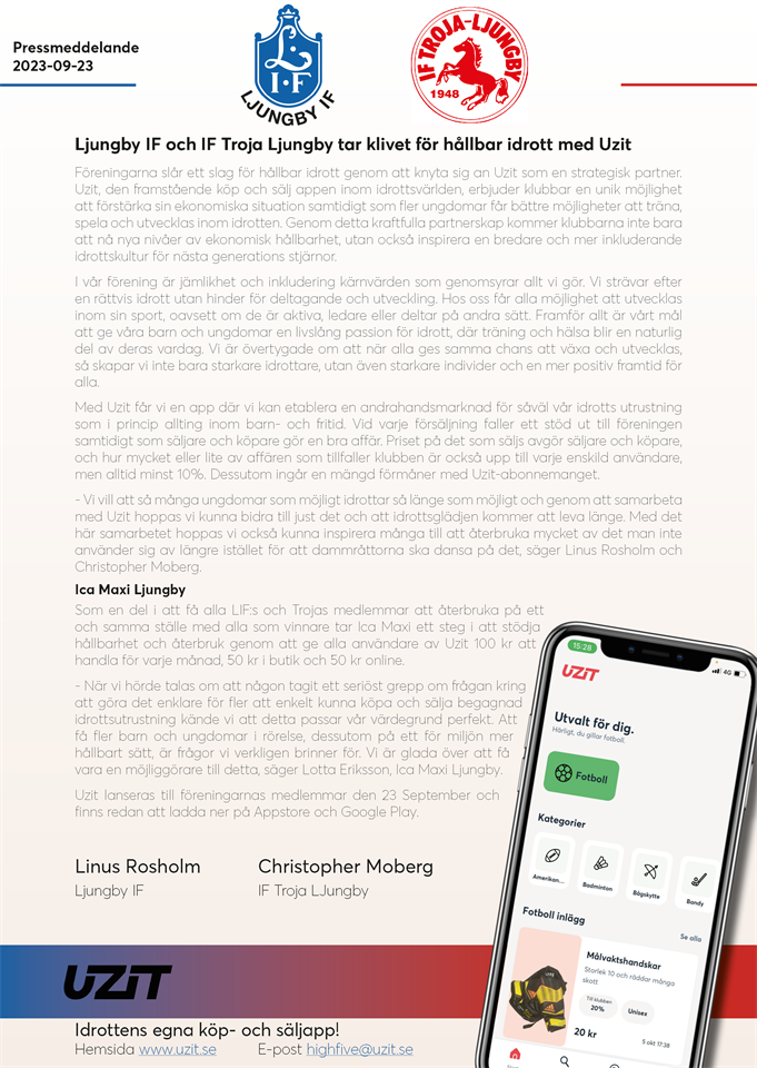 Vi har glädjen att meddela att vi har inlett ett samarbete med Uzit tillsammans med Troja och ICA Maxi Ljungby, läs bifogat pressmeddelande. Uzit har tagit fram en köp och säljapp för begagnad handel av sport- och fritidsutrustning, där du kan sälja produkter du inte har användning av längre. Med Uzit är alla vinnare, både ekonomiskt och fram för allt med återbruk i fokus. Så dags att leta igenom källare och förråd efter produkter du inte längre har användning för och som kan ge glädje till någon annan. Klicka på länken eller kopiera den för att skapa ett konto, eller läs mer om Uzit appen på www.uzit.se https://open.uzitapp.com/GRhqxjGsiDb Ljungby IF 23 sep 2023