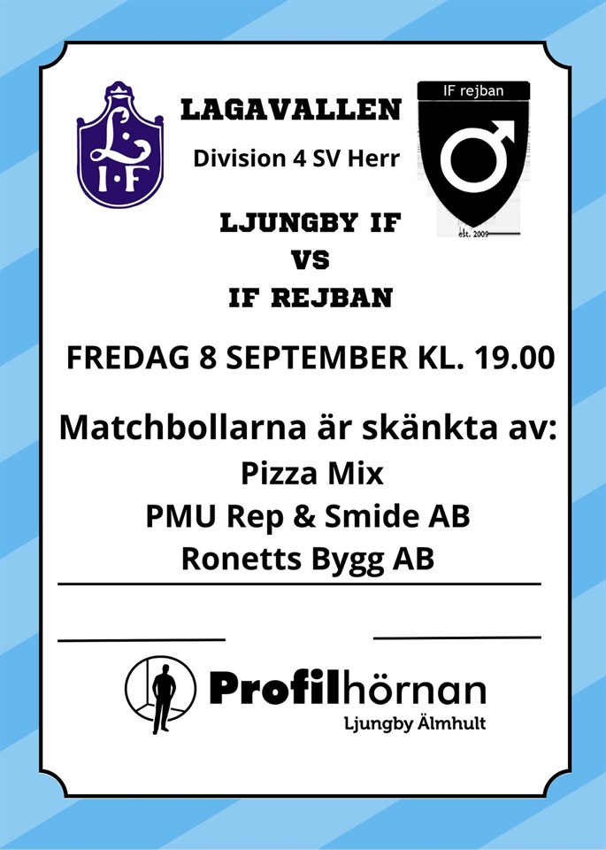 I morgon, fredag 8 september kl. 19.00 gästas herrarna av IF Rejban från Växjö. Efter två tunga förluster, både mot Gransholm och Lagan vill killarna tillbaka på vinnarspåret igen och vi ligger i skrivande stund tre poäng efter gästande Rejban som i nuläget ligger på andra plats i tabellen. Så varmt välkommen till Lagavallen och stötta fram killarna till tre poäng.