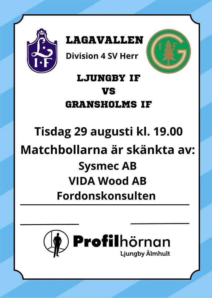 I morgon, tisdag 29 augusti kl.19.00 kommer herrlagets uppskjutna match mot Gransholms IF att spelas. Vi ser fram emot att få träffa dig på Lagavallen och att vi tillsammans stöttar fram killarna till tre poäng⚽⚽⚽.