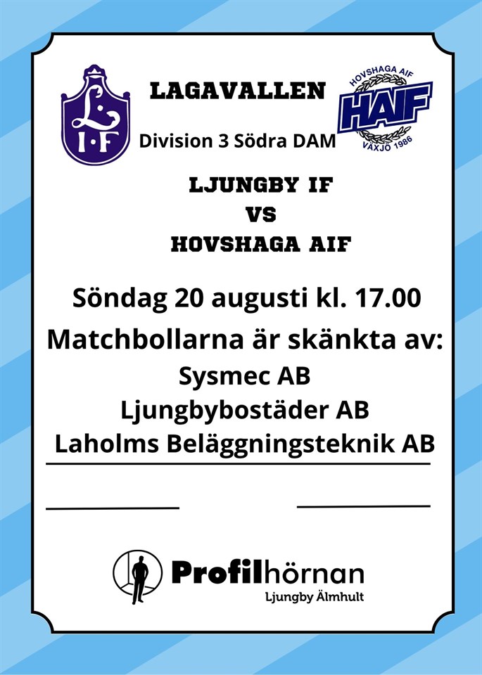 Välkomna till Lagavallen nu på söndag, 20 augusti kl. 17.00 då våra damer gästas av Hovshaga AIF!