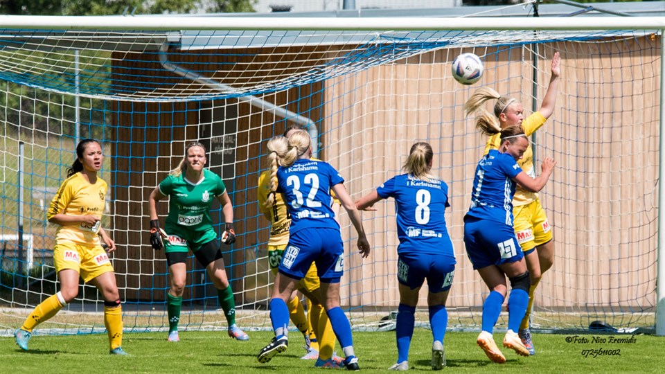 Alltså, det är så otroligt roligt när saker man har tränat på, när matchplanen och saker man gått igenom innan match sitter som dom skall. Vi visste att gästerna Kristianopel är betydligt äldre, mer erfarna och säkert några pannor tyngre än oss, så för oss gällde det att vara snabba i vår tanke, snabba i vårt spel och aldrig bli infångade i svåra närkamper, för dom hade vi förlorat med all säkerhet i dom flesta fall. O så spelar vi som vi har sagt, vi rör oss, är spelbara och vi agerar i dom flesta fall och inte reagerar. Vi skapade också ett par otroligt bra lägen, men vi lyckades inte få dit bollarna under första halvlek. Gästerna hade två jättelägen med vår panter i målet Vera lyckade avvärja båda gångerna. Vill du läsa hela repportaget? KLICKA HÄR Vill du se bilder från matchen? BILDER Nico