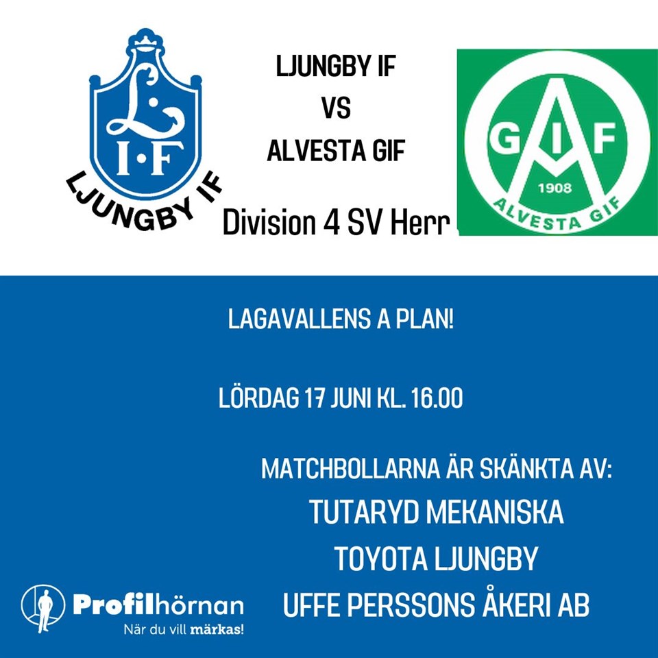 Nu på lördag, 17 juni med matchstart kl. 16.00 gästas vårt herrlag av Alvesta GIF! Serien är jättejämn och vi ligger i nuläget på första plats i tabellen med 18 inspelade poäng och Alvesta på en femte plats med 15 poäng så det är upplagt för en jämn och spännande match. OBSERVERA att det är avspark kl. 16.00 och inte kl. 13.00 som det annar brukar vara på lördagar. Välkommen till Lagavallen!