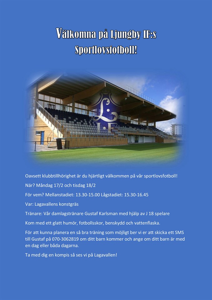 Hej LIF arrangerar sportlovsfotboll. Varmt välkomna alla tjejer som vill vara med. Info i bifogad bild. /Ledarna F 2016 12 feb 2025 0kommentarer