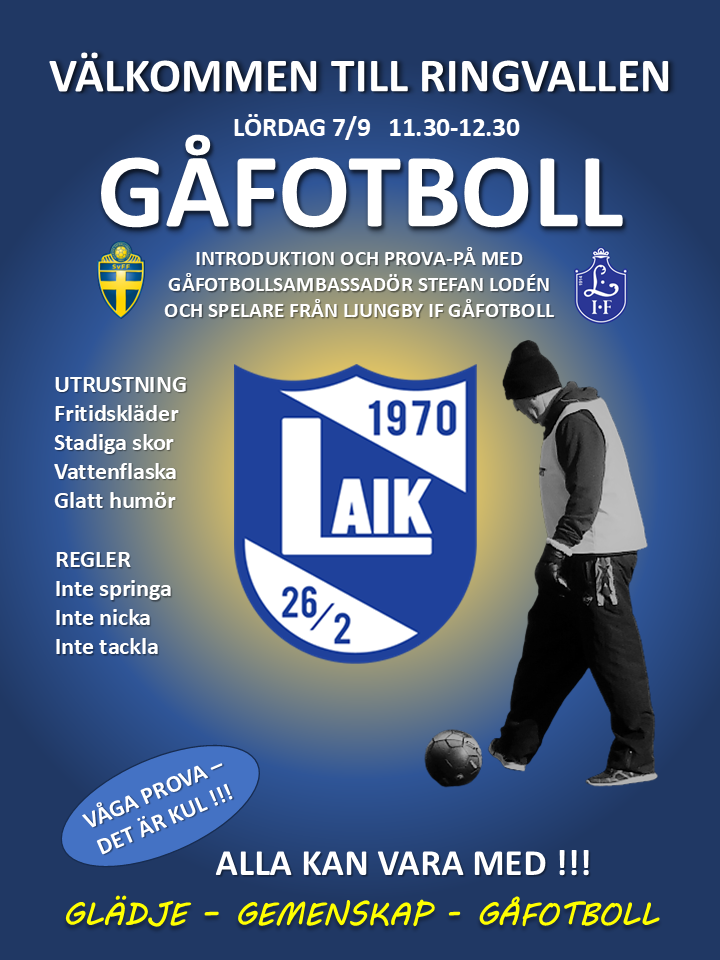 Lördagen den 7 september genomfös en introduktion av vad Gå Fotboll är och även en möjlighet att prova på Gå Fotboll. Stefan Lodén vår ambassadör är på plats och behöver nu några spelare från oss för att visa vad GÅ Fotboll är. Behöver minst 6 spelare gärna fler till Ringvallen Lördagen den 7 september kl.11.30-12.30 En möjlighet att träna på en ny anläggning i kommunen. Skickar ut en kallelse i laget.se så får vi se hur era möjligheter ser ut. Alltid kul att få sprida den idrott och aktivitet som alla vi i gruppen må bra av och ser fram meot att utöva. Alla kan vara med är ju alltid vårt måtto.