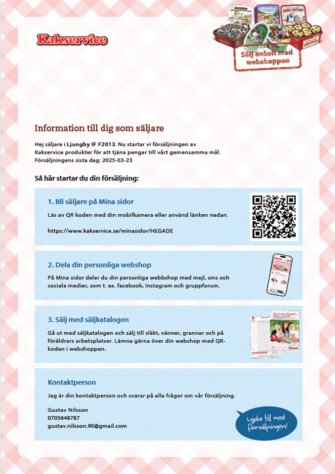 Hejsan. På föräldramötet meddelade vi att det kommer ske en kakförsäljning. (Vinsten går enbart till tjejernas kassa). På nedanstående länk eller QR-kod, lägger ni upp er som säljare och startar er försäljning. Sista dagen sätter vi om 3 veckor, dvs den 23/3. Lycka till! https://www.kakservice.se/minasidor/HEGADE